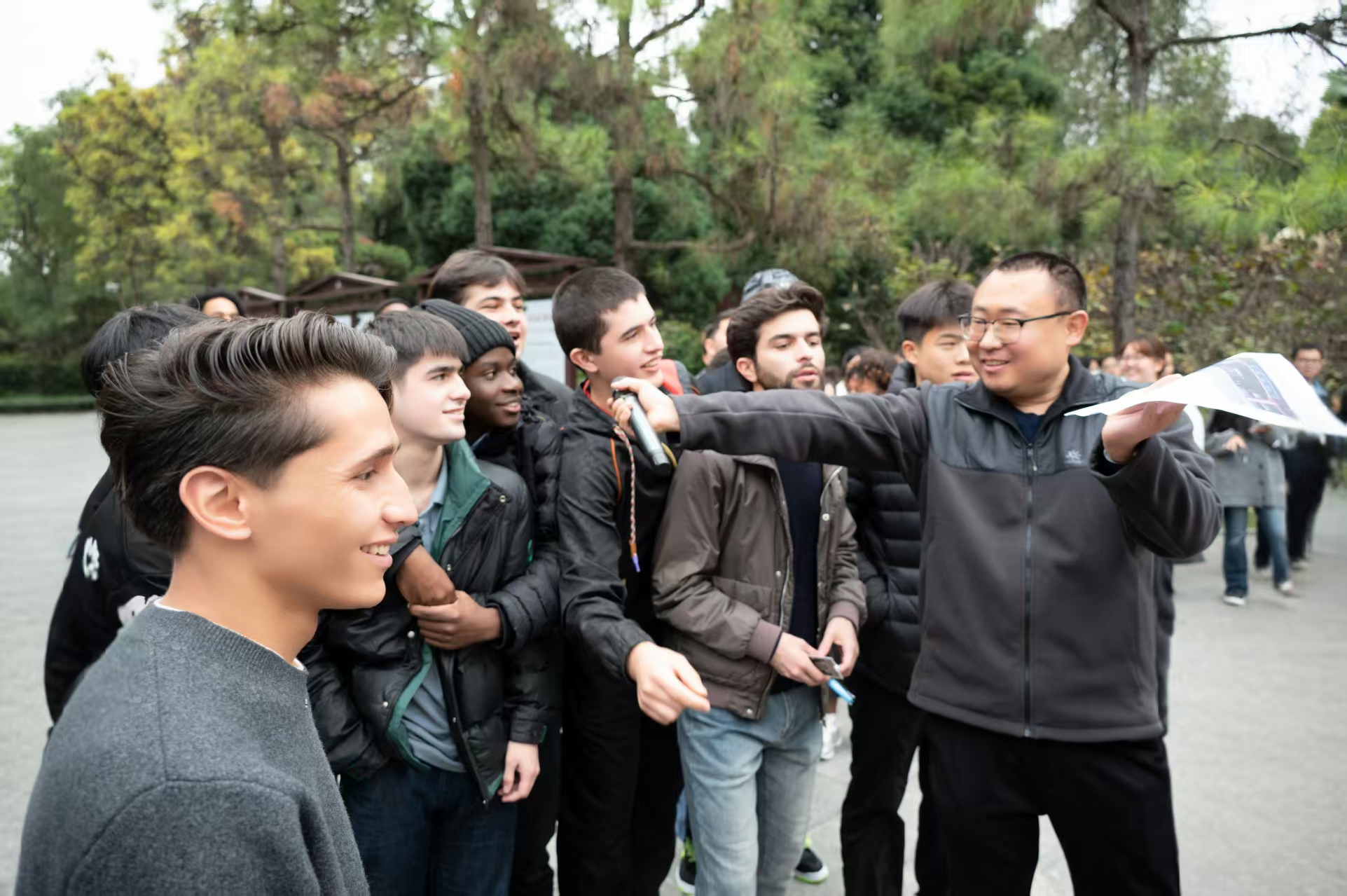 活动现场,留学生们诵读《出师表》的中英文声韵与武侯祠的古柏清风相映成趣,吸引了众多游人驻足围观。在文艺表演与互动游戏环节,中外师生与游客自然互动,大家纷纷拉着外籍师生比出“点赞手势”,用镜头记录下中外青年共探三国智慧的鲜活瞬间。