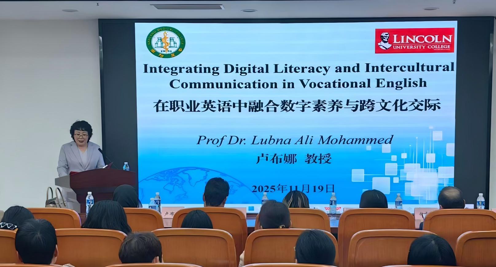 本网讯(文/国际教育学院 徐晓杰)11月19日下午,我校特邀马来西亚林肯大学学院教育学院院长卢布娜·阿里·穆罕默德教授,以《整合数字素养与跨文化沟通于职业英语教学》为题开展学术讲座。讲座由纪委书记刘金云主持,林肯大学学院、伊密里欧学院来宾及我校师生代表参加。