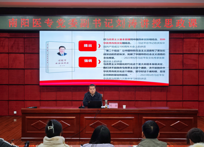 本网讯(文/医学技术系 雷呈)为深入学习贯彻党的二十届四中全会精神,引导青年学子在新时代坚定文化自信、勇担时代使命,12月12日,校党委副书记刘涛在图书馆为医学技术系师生讲授题为“在‘第二个结合’指引下,以文化自信铸牢青年担当”的思政课。