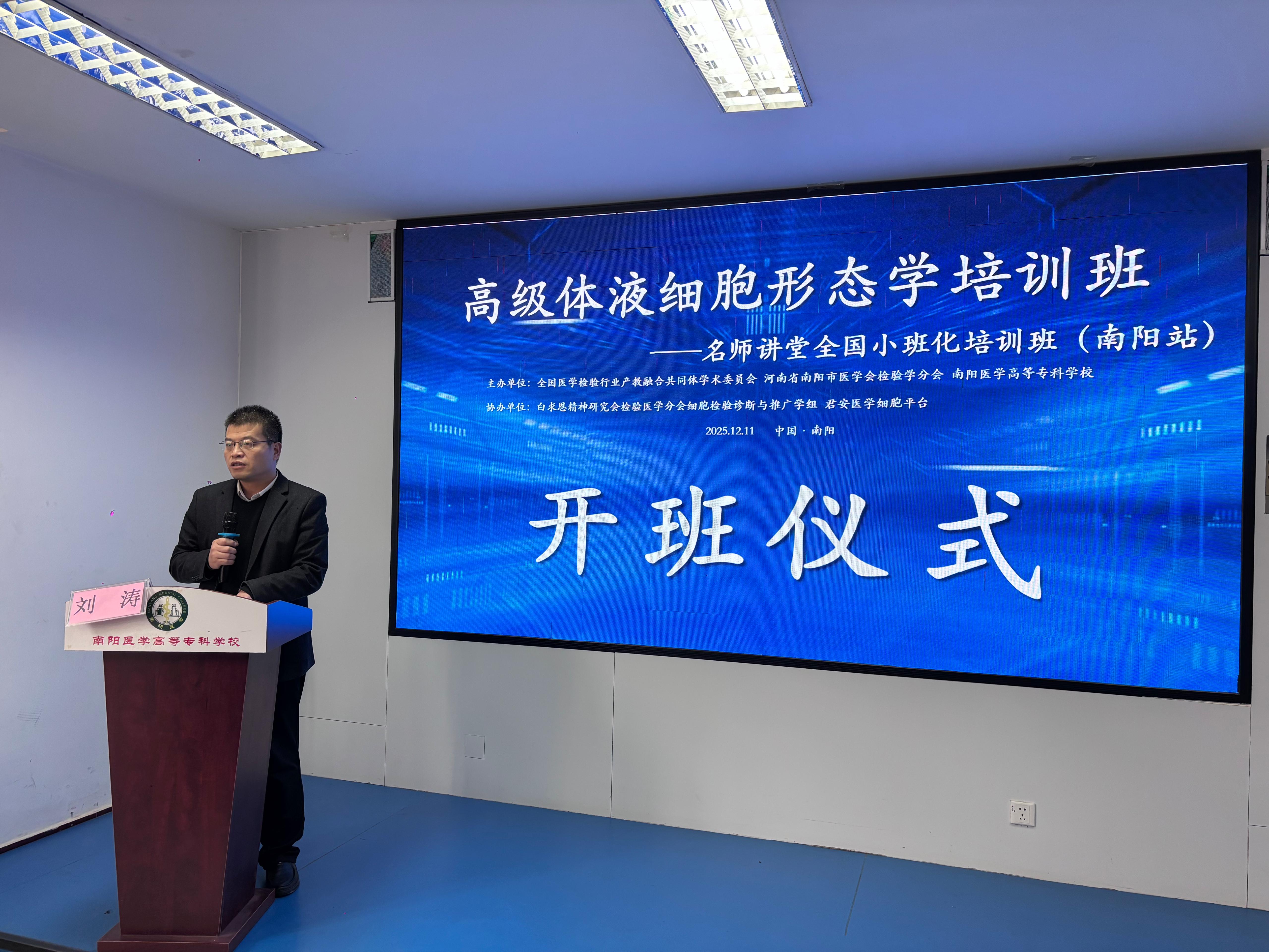 12月11日下午,培训班举行开班仪式。我校党委副书记刘涛出席并致辞,南阳市医学交流和项目推进中心主任张淼、全国体液诊断领域知名专家吴茅教授,以及南阳市医学会检验学分会相关领导、全体学员参加。仪式由南阳市医学会检验学分会主任委员、南阳市中心医院医学检验科主任杜伟鹏主持。