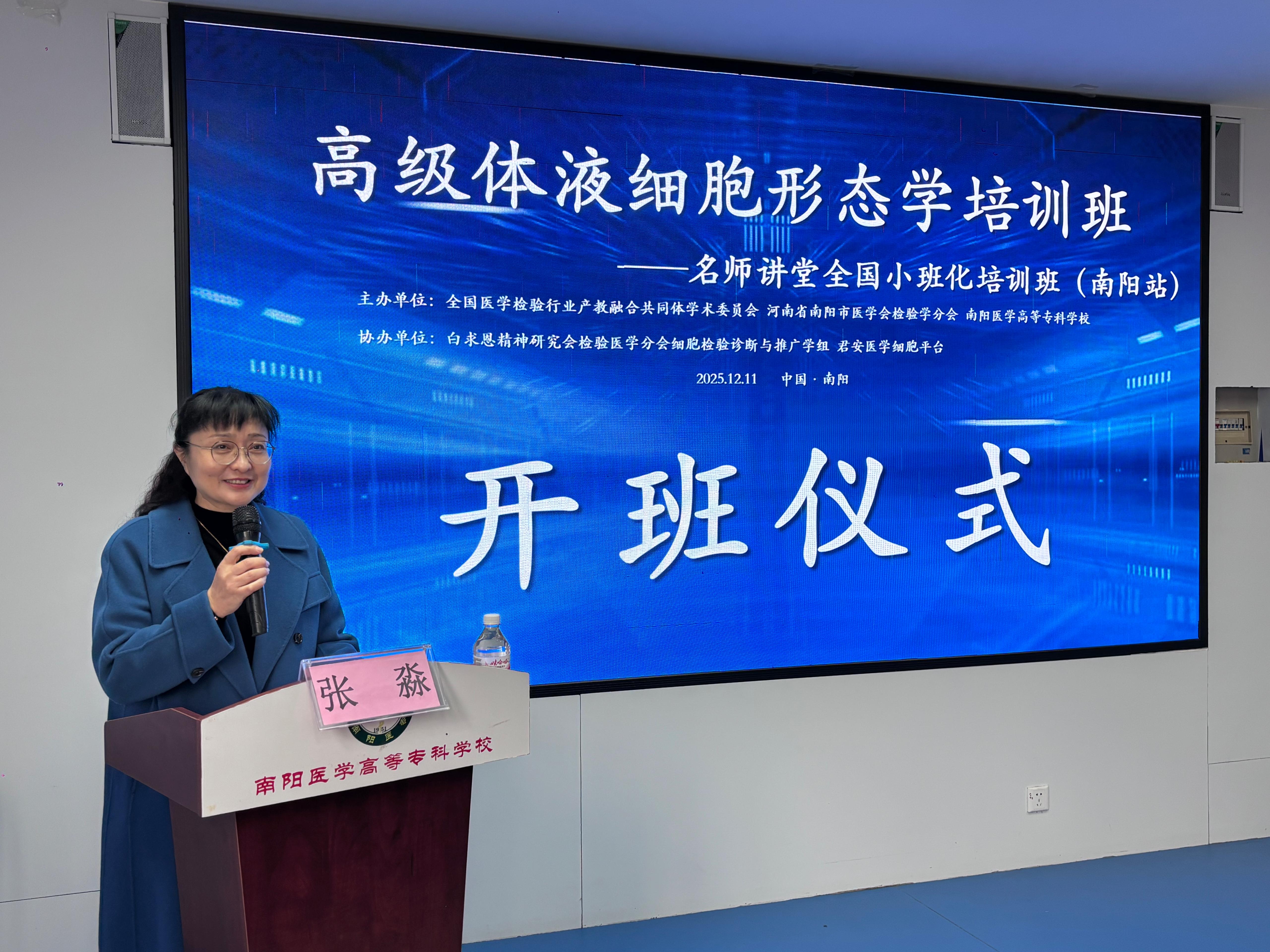 本网讯(文/医学技术系 赵景颇)12月11日至14日,由全国医学检验行业产教融合共同体学术委员会、南阳市医学会检验学分会和南阳医学高等专科学校主办,白求恩精神研究会检验医学分会细胞检验诊断与推广学组、君安医学细胞平台协办的高级体液细胞形态学培训班在我校仲景西区圆满落幕。本次培训吸引了来自河南、江苏等地医院的40名检验科主任及业务骨干积极参与。