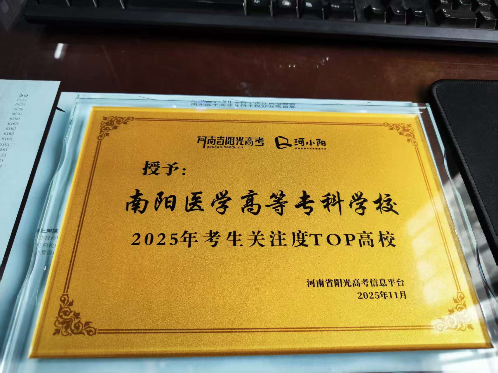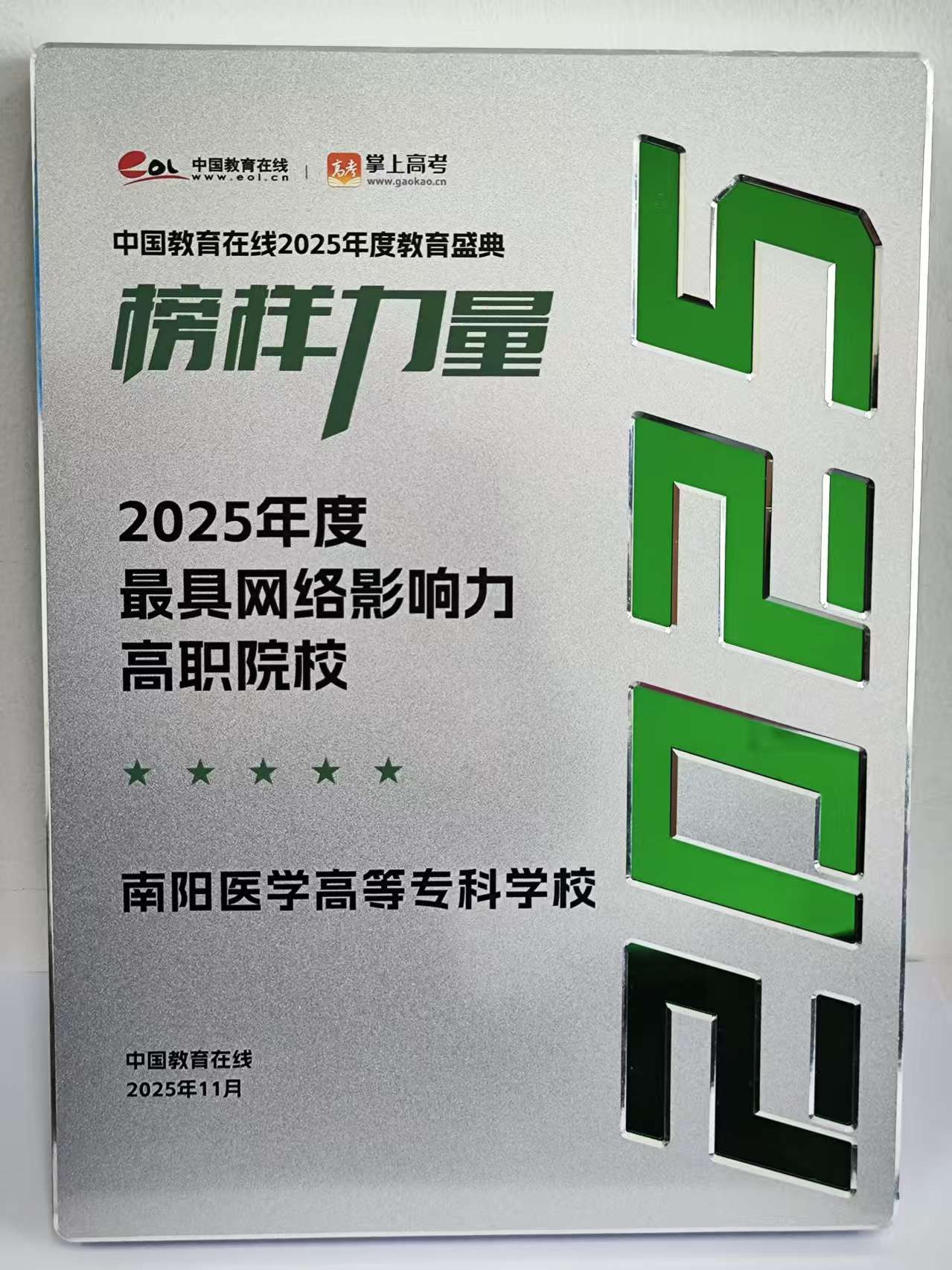 本网讯(文/招生办公室 张旭)近日,从中国教育在线“榜样力量· 2025年度教育盛典”传来喜讯,我校在全国众多高校中脱颖而出,成功获评全国“2025年度最具网络影响力高职院校”,在河南阳光高考信息平台获得“2025年考生关注度TOP高校”称号。这两个称号的获得,彰显了我校创新性与前瞻性的招生宣传策略、扎实过硬的招生宣传实力以及逐年攀升的考生满意度,标志着我校招生宣传实力已位居全国前列。