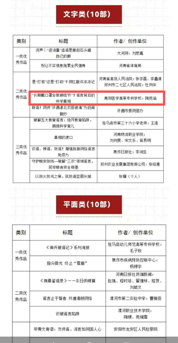 本网讯(文/口腔医学系 原莹)近日,由河南省委网信办、省委政法委、省委金融办、团省委、省文明办、省科协、省教育厅等多部门联合主办的2025年度河南省互联网辟谣优秀作品发布活动暨“e起辟谣 清朗有我”网络辟谣沙龙(第四季)优秀作品名单揭晓。经过作品初审、网络投票、专家评审等环节共评选出文字类、平面类、重大辟谣专题等共36部优秀作品,我校口腔医学系学子陶雨涵创作的科普作品《“长期戴口罩会致肺结节”?谣言背后的科学真相》,在全省参赛作品中脱颖而出,荣获文字类二类优秀作品。