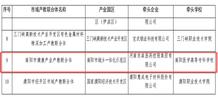 本网讯(文/教务处 李梦华)近日,河南省教育厅公布了河南省市域产教联合体名单,我校作为职业院校牵头单位的“南阳市健康产业产教联合体”名列其中。这是我校继获得“全国高职院校产教融合100强”后的又一重要荣誉,标志学校持续深化现代职业教育体系建设改革取得实质性突破。