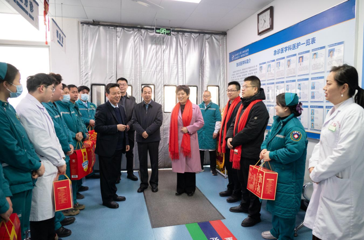 随后,校领导一行前往学校三所直属附属医院,深入临床一线、值班科室,详细了解节日期间值班值守、患者就诊量、医疗救治及物资保障等情况,向一线医务工作者致以崇高敬意和新春祝福,为他们送上慰问品,并叮嘱大家坚守岗位的同时做好自身防护、注意劳逸结合。范真表示,医务工作者舍小家为大家,用坚守诠释医者仁心,希望大家坚守初心、精进技艺,持续提升医疗服务质量,守护群众生命健康。医护人员表示,将不负信任与期望,全力做好节日医疗救治工作。