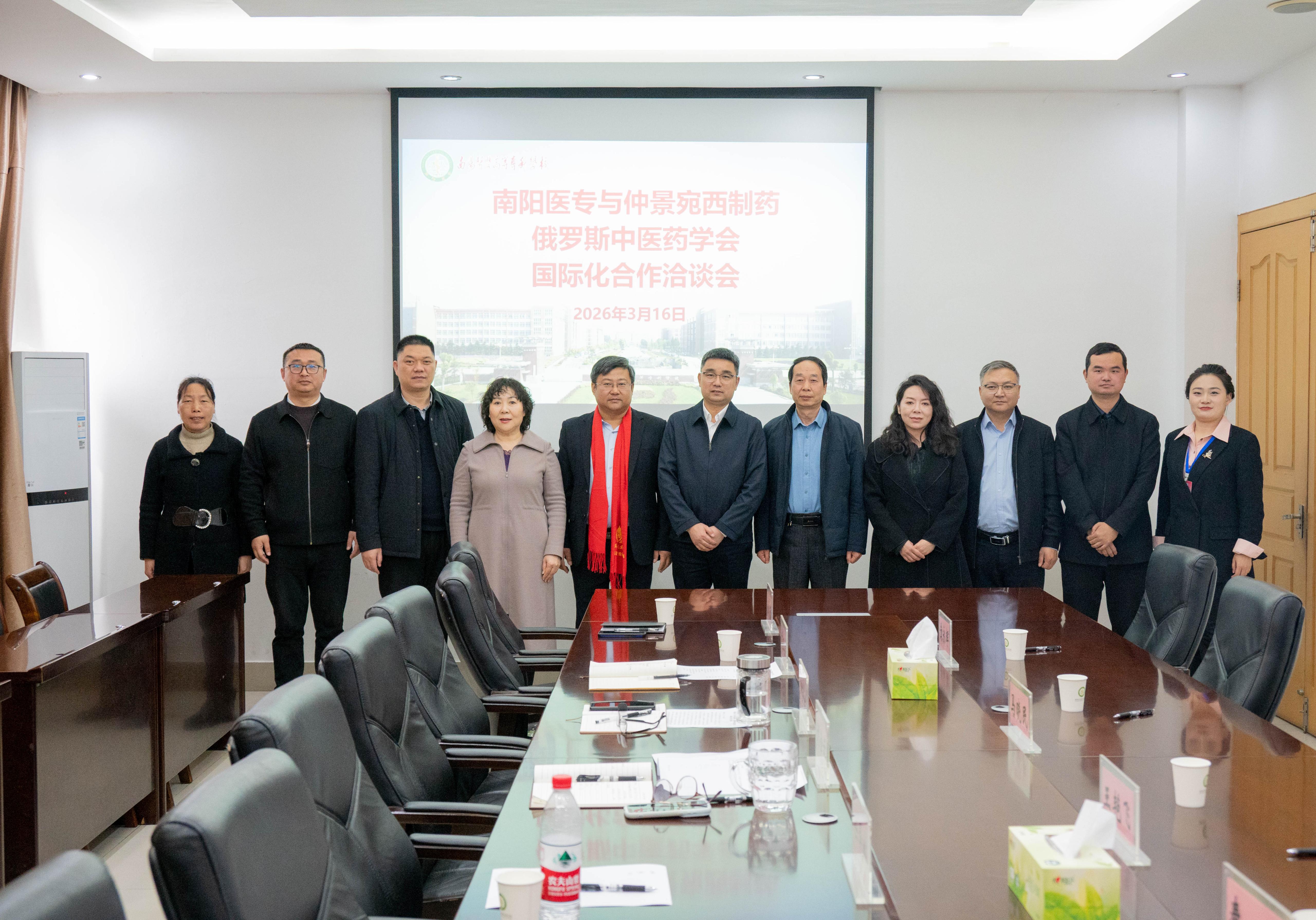 本网讯(文/对外合作交流处 周国军 张瑶)3月16日上午,我校与仲景宛西制药、俄罗斯中医药学会国际化合作洽谈会在仲景西区一号办公楼2号会议室举行。纪委书记刘金云、副校长刘荣志、仲景宛西制药副总经理马晓民、俄罗斯中医药学会会长任泽斌出席,仲景宛西制药相关部门负责人及学校相关部门负责同志参加。会议由刘金云主持。