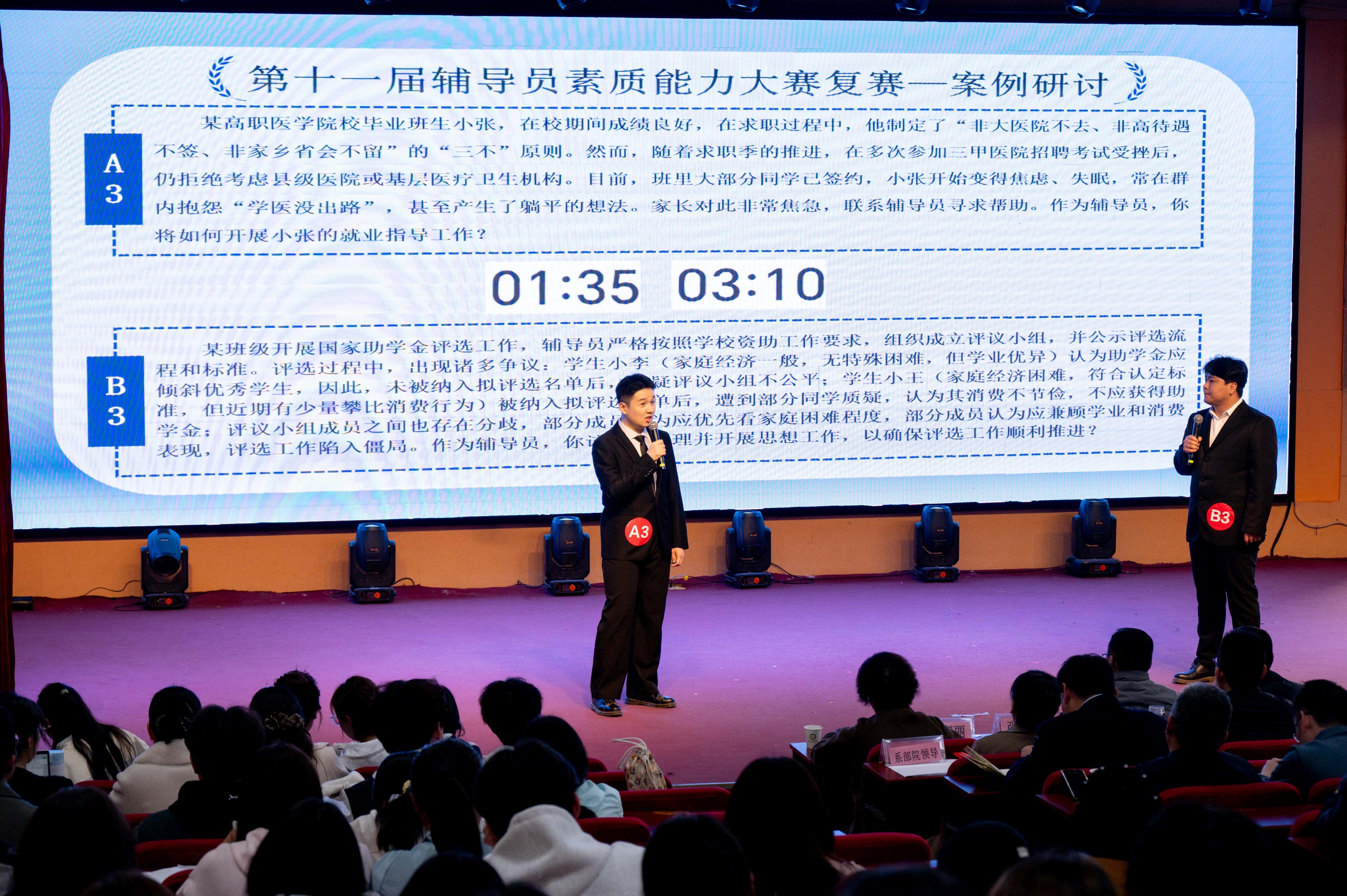 本次大赛以“以赛促学、以赛促练、以赛促干”为宗旨,设基础知识测试、案例研讨、谈心谈话三个环节。经过初赛筛选,8位辅导员晋级复赛。在案例研讨环节,选手们围绕宿舍安全、电信诈骗、学风建设等一线典型案例展开智慧交锋,剖析精准、思路清晰,最终6人挺进决赛。