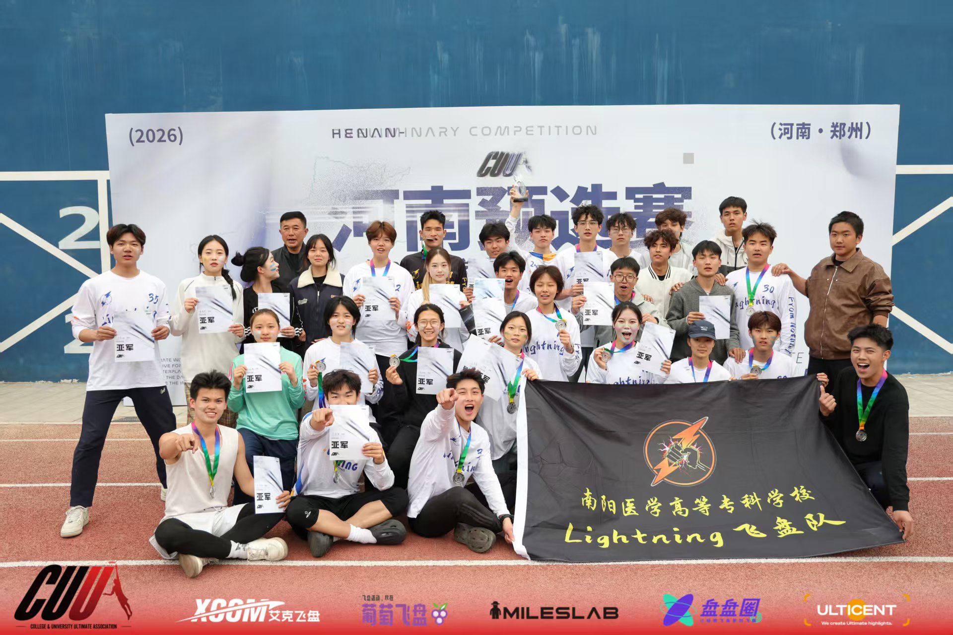 本网讯(文/体育保健与运动医学系 李戈)3月29日,第八届中国大学生极限飞盘联盟(CUUA)全国大学生飞盘联赛河南预选赛圆满落幕。我校飞盘队在曹晓峰、倪立两位教练的带领下,历经多轮激烈角逐,从全省多支队伍中脱颖而出,最终斩获赛事亚军。