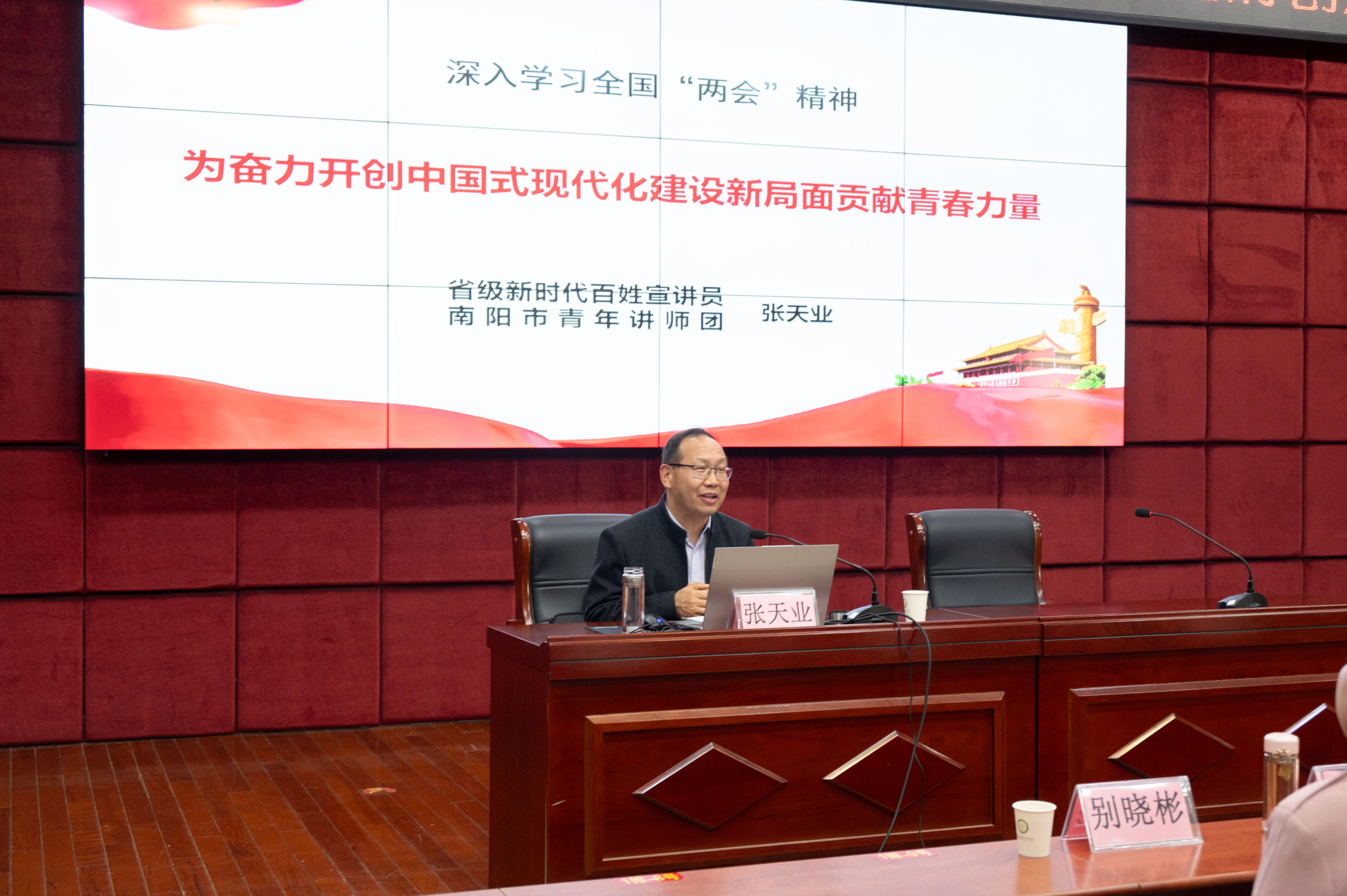 本次宣讲由南阳市青年讲师团团长、社旗县委党校副教授张天业主讲。张天业以《深入学习全国两会精神,为奋力开创中国式现代化建设新局面贡献青春力量》为题展开宣讲,紧扣习近平总书记全国两会重要讲话精神,深入解读政府工作报告核心要义,系统阐释“十五五”规划部署要求,引导青年学子把握时代脉搏、明确发展方向,并勉励大家怀抱梦想、脚踏实地、自信自强、持之以恒,争做有理想、敢担当、能吃苦、肯奋斗的新时代好青年。