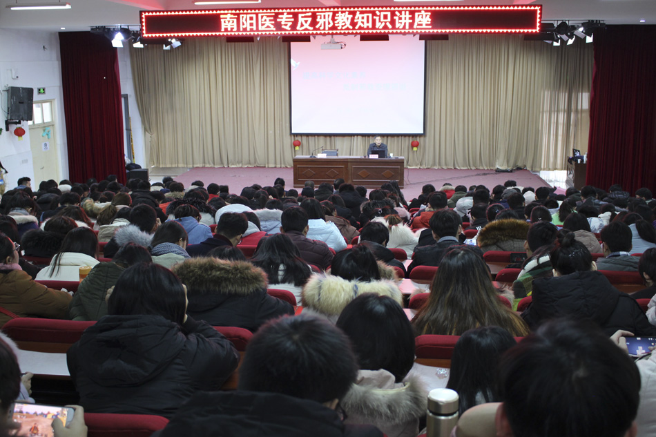 李科长以“提高科学文化素养,抵制邪教歪理学说”为题目,结合大量图文并茂的课件,从什么是邪教,邪教的特征,邪教种类简介,遇到邪教怎么办,全面系统讲解了关于邪教的知识。讲解内容丰富透彻,重点突出,既有理论深度、又有实践高度,具有很强的指导性和针对性,结合具体案事例深入浅出细致的精彩讲解,赢得了在场广大师生的高度评价。师生们纷纷表示,对邪教相关知识有了更全面更系统地了解,这也必将为我校思想道德教育工作,进一步培养学生树立正确的世界观、人生观、价值观起到积极作用。最后,李科长对我校辅导员、班主任老师如何做好防范邪教工作等方面提出了具体要求。